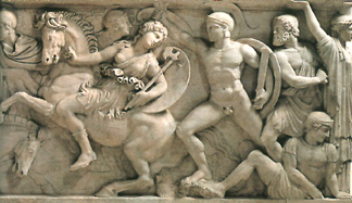 tasks executed in other countries by women. Whether men were or were not included in the Amazon state, only women bore arms, not only defending their own country, but making conquest expeditions into neighboring territories. They fought both on foot and on horseback, carrying crescent shields and wielding spears, bows and battle axes. In some myths, it is said female children had their right breast seared in order to draw a bow and throw javelins more effeciently as adults. War, hunting, agriculture and training girl Amazons were their principal pursuits. It was said they were the first humans to ride on horseback. The Amazons were especially devoted to the goddess of hunting, Artemis. Stories about the Amazons belong to the earliest Greek sagas. Homer mentions them in a way which shows that they were familiar to his audience. When in historical times the Greeks became familiar with the Thermodon region and found no Amazons there, they supposed either Heracles (Hercules) had destroyed them all, or they had been driven away. Thus in later legends, the Amazons were moved further and further away from their original homeland, but they were always located on the fringe of the world as it was then known to the Greeks. They were said to be of Scythian origin from Colchis (south of the Caucasus) and there was also supposed to be a race of Amazons in Africa. They were, at any rate, always foreign to the Greek homeland, and to the Greeks, like all foreigners, they were viewed as barbarians. The Amazons were a favorite subject for Greek sculptors and painters. In art of the earliest periods, they are dressed exactly like Greek warriors, but usually with one breast bare. After the Persian Wars (499-448 BC), for example on Greek vases of the great classical period, they are represented in oriental garb, wearing caps and trousers, and pictures of them relate more to known legends about them. They are never depicted as having lost one breast, in spite of the Greek belief their name meant 'breastless'. Various explanations of the origins of the legends about the Amazons have been put forward. Some writers trace them to the armed slave-girls who served certain Asian deities. The association of the Amazons with Artemis supports this theory, but the story is more likely to be an imaginative Greek elaboration of reports about matriarchal tribes in southwest Asia, or of tribes in which the women led a freer and tougher life than they did in Greece. The persistence of the legend up to the 2nd and 3rd centuries AD, and its popularity as a theme in the arts show the Amazon myth had a deep appeal to the Greeks. More Web sites by