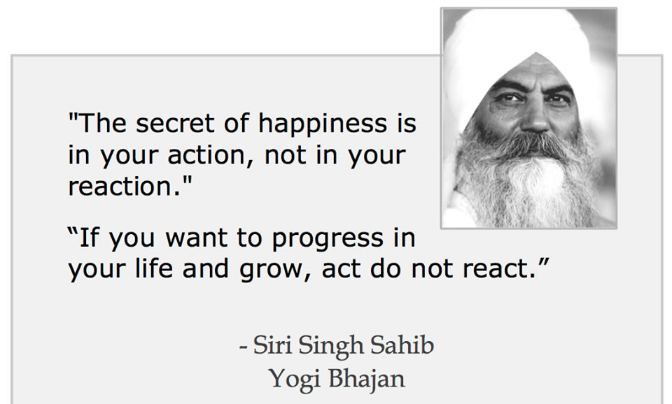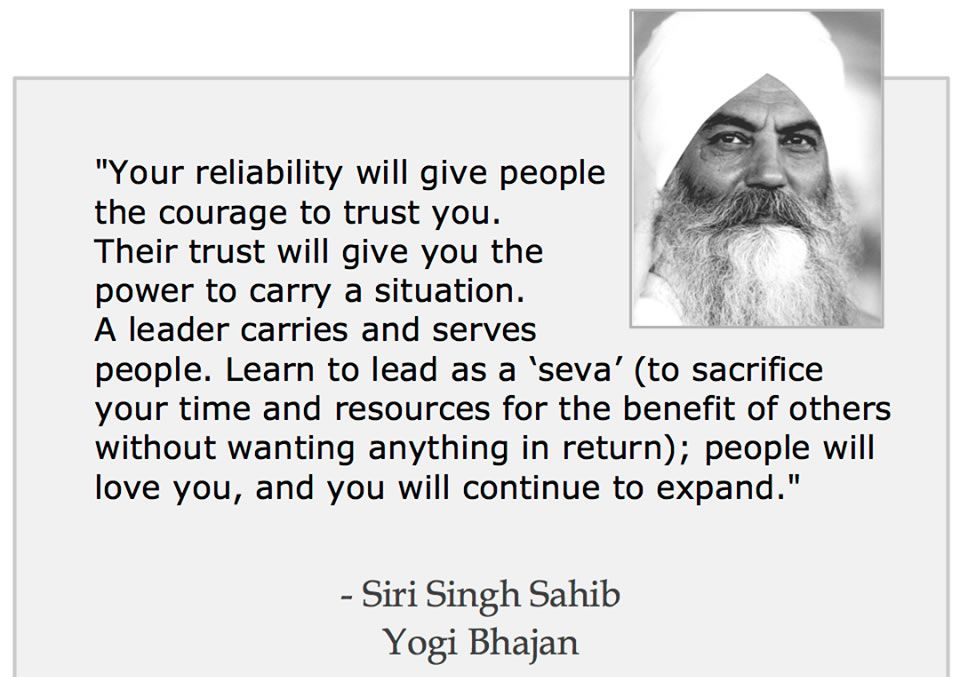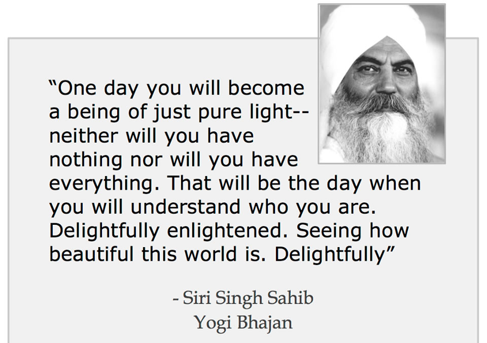 Teachings of Yogi Bhajan You know you have life that you can live. You can have all that you need. That is destined. More than that you can only get, if you open yourself up. Open your door; open your heart to others. You have to show that you are the beloved of the Lord and you are here to live a life for everybody. And this is unlimited. Whatever life is given to you by the pranic energy is unlimited. There’s no other way on the planet to free your soul unto the destiny and unto God but by serving those who need a hand -- smiling at them, wiping away their tears, forgiving them. Harmony should bring you success. It should bring you peace. It should bring you tranquility. It should bring you happiness. It should bring you the things you need. You don?t believe it. A yogi is a person who can totally amalgamate himself with you at your level, experience it and realize it, and then pull you up. Happiness is a by-product of the totality of life, which has to be shared compassionately and kindly with all. Serve all without classification or discrimination. Discrimination means you have reservation, which comes from fear, phobia, non-Infinity. In the worst scenario, sit down, close your eyes and talk to your own soul, spirit. The moment that becomes your attitude, all things you need in life shall come to you. We do not understand that the most important aspect of a human is the consciousness. We do not have the power of commitment if we do not have consciousness. We do not have the power of conception if we do not have consciousness. And when we do not have consciousness, we do not have basic intuition. Once a man adapts himself to righteousness, then no sacrifice is painful. As long as a life of righteousness is not adopted, everything is painful. I am trying to relate to you the power that lies in obedience to your own commitment. Once you commit, obey the commitment and everything that you want to achieve you shall achieve. You have not learned to live by the decoration, beauty and make-up of grace. You have learned to look beautiful by your make-up. And you cannot improve on the work of God. Your make-up does not make any sense. That's why, spending all the money on make-up, still you are miserable. Nobody can improve on what He made, the Great Creator, the artist, whose creation you are. The soul has a journey and it is pre-destined. It selects its longitude and latitude to be born. It selects its geography; its space, its protective, nurturing essence of the parents; mother and father, and its environments. All the aspects, all the events that happen in the first seven years are set. It is like when you have a book. Let us say somebody has a sixty-page book that's called "Life". Every page has to be turned and every page has to be read. Every page has to be gone through and has to be understood. In between, there will be things you highlight -- the things you like. There will be things that bring tears to your life, and there will be things that are dreadful, things that are right and things that are wrong. So, let us say that life proceeds like a book. Elementary tomorrow is already in existence. You have to walk on it... When you are in the state of the neutral mind, the soul is like a chandelier switched on over you. Communication of the soul is just that light; you are lit up by it. In us there are three values: we are angels, we are humans and we are animals. Our barbaric animal nature is to live at each other. Our human nature is to live with each other and our angelic nature is to live for each other. That should decide all of our behavioral aspects if we start looking at this trinity, that is what our behavior is. Whenever you decide to deal with somebody ask yourself, "Am I an angel? Am I going to do it angelically? Am I doing it humanly? Am I going to be a brute-barbaric and neurotic?” Every calamity is the test of our reality. Never be afraid of it. Whenever you face calamity with your reality, you shall win because God shall be on your side. You have come from the Perfect to be perfect. It is not that you have come from the Perfect and you have been put here as imperfect, and you have to become perfect. Your prosperity is based on your spoken word. With one word you can make a friend, with one word you can make an enemy. With one word you can win a heart, with one word you can break a heart. Middle-aged crisis come from the fear of being old. Instead of being joyful about maturity, people start getting scared of being old. A woman who knows how to save her grace can always uplift humanity. The next sentence shall be in the scriptures: Humanity, in its dignity and divinity, lives because of the grace of a woman. I am not talking about the humanity who boozes, the gamblers, the thieves. They are humanity, too, but that humanity is a polarity. I am talking of the divine sect of the humanity that lives; whatever is left out is because of the grace of the woman. I said once before, and I say it again today, there shall be no peace on Earth if those born of woman do not recognize the divinity of the woman. People who love each other don’t bargain. Love has no such thing as business. Love has no conditions, because love does not obey time and space. If the entire divinity and domain of God sits in the heart of a person, and his longing becomes timeless, then man can develop the capacity to love. There is no liberation without labor. There is no freedom, which is free. You think that when you love somebody you have to totally follow him or her. No, that's not love. When you love somebody, you have to be totally truthful with that person. It is a gradual experience and a perfecting of your own projection and the mind, which have to be brought in tune with the God-consciousness. And that takes a practice and a sincere effort on your part. You have to be sincere because you will definitely be tested. A woman who is not a leader is a miserable person… A leader has three things.
